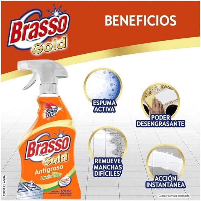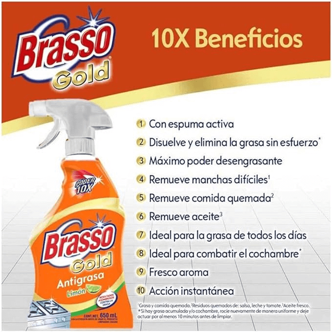 - Brasso Cocina con su máximo poder desengrasante, disuelve y elimina rápidamente la grasa en su cocina dejando un fresco aroma