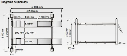 Tiene una estructura metálica especialmente diseñada para soportar la mayor parte de los vehículos de hasta 4 toneladas. Opera con una bomba electrohidráulica a 220 V. Tiene plataformas de ancho ajustable.