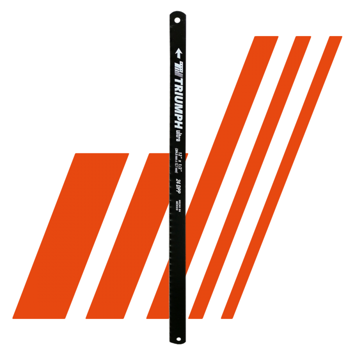SEGUETA TRIUMPH ULTRA 24DPP Las seguetas bimetálicas Ultra son fabricadas con acero de alta velocidad M2 de la más alta calidad y acero flexible con alto contenido de carbono. La combinación de aceros y proceso de temple de alta tecnología nos permite un rendimiento extraordinario y un cuerpo flexible resistente a la rotura. Para uso en metal, lamina, pernos, canales, varillas de perforación, varillas roscadas, tubos, tuberías y madera.